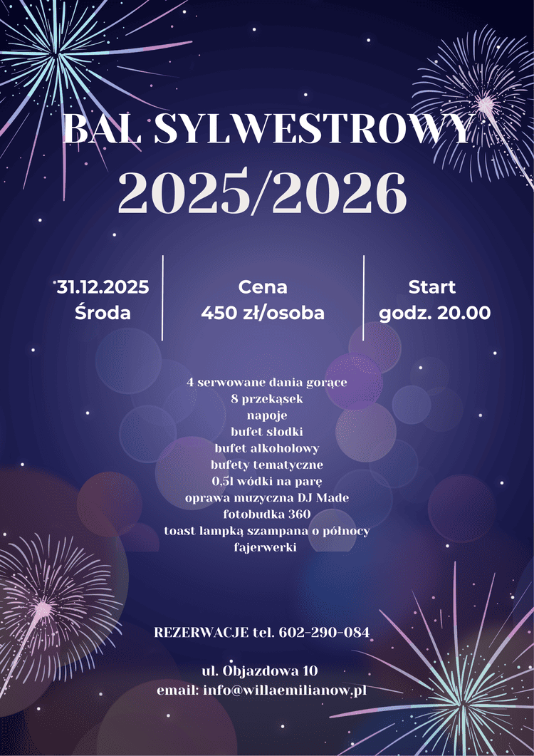 Zapraszamy do nowej, stylowej, eleganckiej sali bankietowej w Willi Emilianów. Bardzo blisko Warszawy, w urokliwej miejscowości Emilianów, oddajemy do Państwa dyspozycji miejsce, które daje możliwość organizacji niezapomnianej imprezy, w idealnych wręcz warunkach. Smakowite jedzenie, piękny ogród, niesamowita okolica, komfortowa sala bankietowa – to tylko wstęp do tego co możemy Państwu zaoferować!